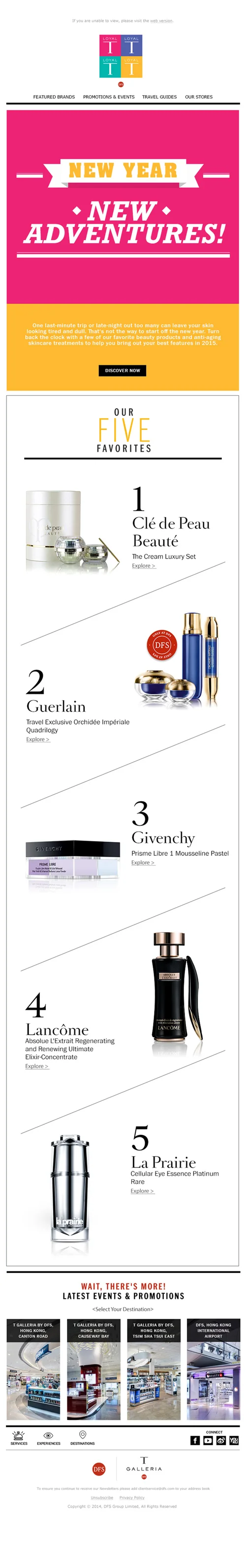 DFS launched a global email marketing campaign called “Our Five Favorites” to promote its Beauty & Fragrances category. The assignment was to choose the theme and create the title and copy for each installment. The company’s category marketing team selected the products. The message was translated into Japanese and Simplified Chinese and distributed to all LOYAL T by DFS members worldwide.