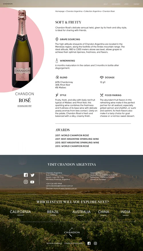 I collaborated with Chandon’s global marketing team during their rebranding to help bring together the identities of their six wineries around the world under one flagship brand across all their digital channels. The assignment was to create content for the brand’s first global website, including brand, country, and product pages, as well as developing an editorial calendar, guidelines, and copy for their Facebook and Instagram accounts.